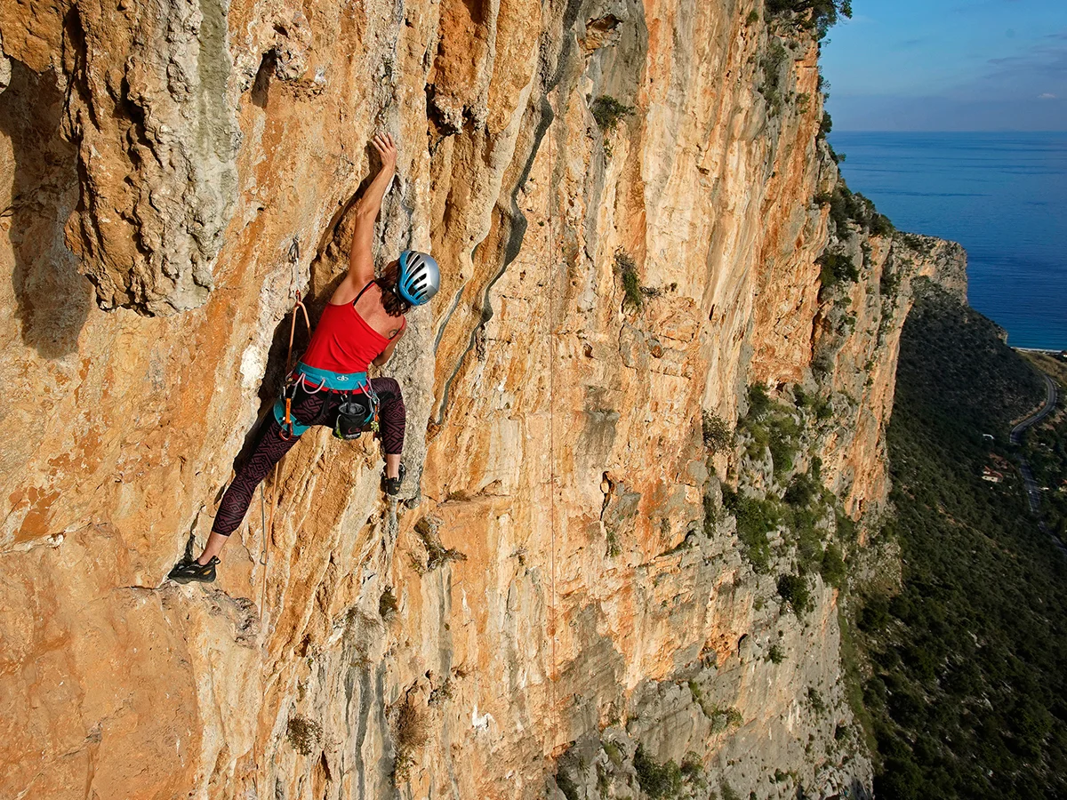 Nancy climbing ‘Wolfgang Güllich’ at Leonidio. Photo by Ralf Dujmvoits.