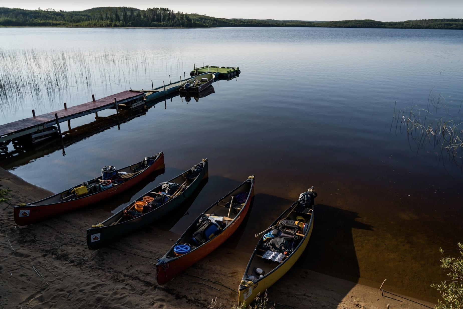 Meeting in the small town of Missinipe — a five hour drive north of Saskatoon — our team travelled by float plane to the middle of Lower Foster Lake. Most canoe groups start at the mouth of the river on the very south end of the lake. But we were enticed by the stacked contour lines surrounding the northern half of the lake. While it’s common for the glacier-formed rock faces in the area to be more sloped, we were thrilled as the plane descended and we could see vertical cliffs in every direction.